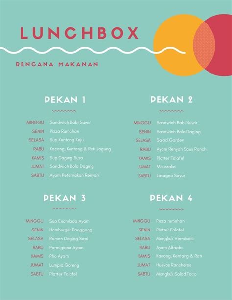 Dengan membuat menu mingguan, kita bisa membeli bahan makanan secara efektif dan menghindari pemborosan. Kita juga bisa memasak dalam jumlah besar dan menyimpannya untuk bekal makan siang di kantor atau kuliah.